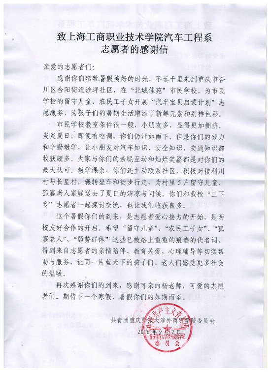 9月10日,学院收到重庆师范大学涉外商贸学院感谢信一封,表达了对于汽车工程系组织2016年大学生暑期社会实践团队10人,前往重庆合川开展为期9天的“汽车宝贝启蒙计划——留守儿童体验式教学”活动成效的感谢与认可。