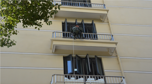 被困人员脱离危险后,望新消防中队讲解在无消防官兵到场时,高层如何通过缓降绳自救。通过模拟救援让师生们了解火灾被困时的正确应对方法。整个演习在紧张、有序的氛围下进行,所有师生都按计划方案行动,仅用了两分12秒便迅速安全撤离险境。