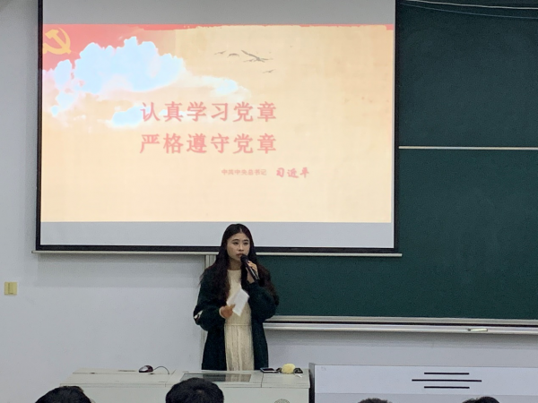 开班典礼结束后,由党支部宣传委员干书娟为入党的同学们讲授党章的性质与意义,阐述党章的重要性,要求同学们认识党章,遵守党章。并且能够在思想上坚持对党的忠诚,才能不受各种利益的驱使,保持自己的本色。