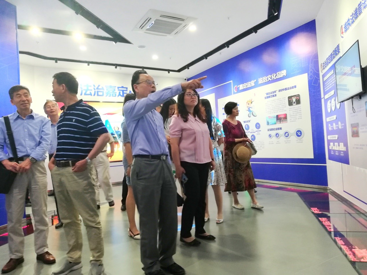 法宝中心一楼,第一展区是法治中国,进门显示屏用于播放关于全面依法治国的相关宣传片。第二展区是法律百科,展示了我国的社会主义法律体系的构成。第三展区是法律护身,介绍如何运用法律来保护自己。第四展区是法治嘉定,拼接屏动态演绎嘉定的法治建设风貌。第五展区是模拟法庭,第六个展区是法宝达人。法宝中心二楼,分为宪法主题馆和法宝书画院两个部分。法宝书画院有嘉定区法治文化节优秀作品,通过参观展览,进一步加深了大家对法治文化的认识。