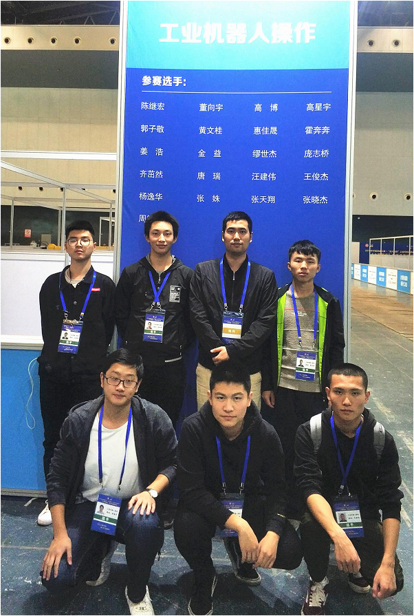 工业机器人操作与示教项目参赛选手(前左一:杨逸华,前中:齐茁然;前右一:王俊杰,后左二:周智赟)
