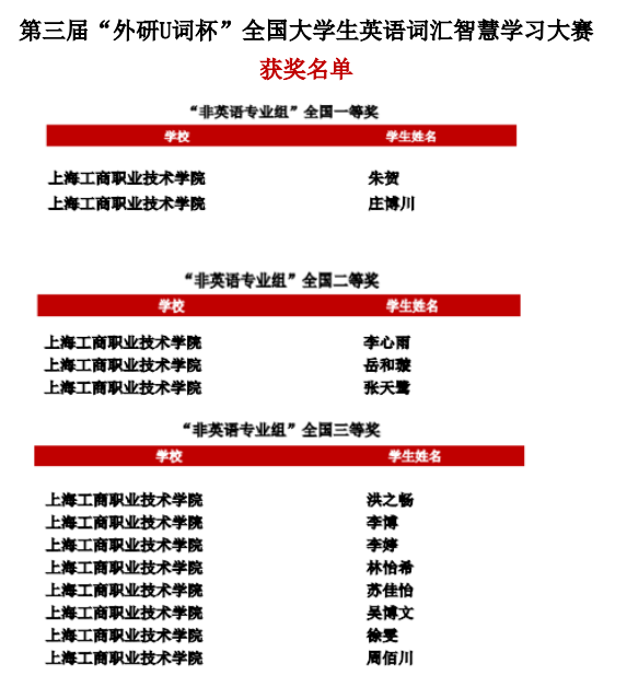 近日,由外语教学与研究出版社主办的2025年第三届“外研U词杯”全国大学生英语词汇智慧学习大赛获奖名单公布。教育学院高职英语教研室积极组织辅导学生参赛,我校学生获大赛一等奖2项,二等奖3项,三等奖8项。