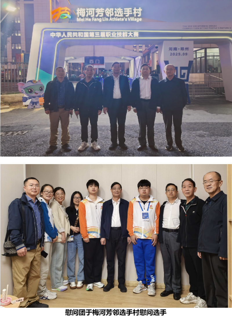 为全方位做好选手保障工作,助力稳定发挥,比赛前夕,校长叶银忠、副校长李向明带队,教务处处长赵双全、智能制造与汽车学院院长叶建农、大唐信息技术学院副院长程熙熙共同组成慰问团,专程前往郑州赛事现场,看望慰问参赛选手、执裁专家及指导教练。慰问团详细了解选手赛前准备、训练状态与比赛期间保障情况,鼓励选手们以平常心发挥专业水平,展现上海工商职业技术学院师生的技能风采与精神风貌,对执裁教师、教练团队的悉心指导表示感谢,为参赛团队注入强大精神动力。